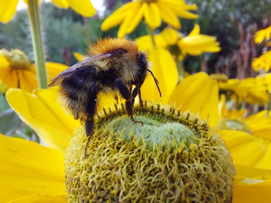 Hummeln sind fleißige Blütenbestäuber! Sie sammeln aber mit ihrem Rüssel auch Nektar, den sie als Nahrung brauchen. Hummeln fliegen sogar wenn es regnet.