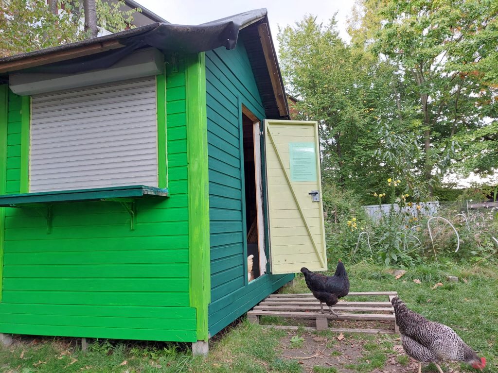 Ihr kennt sie bestimmt alle, die schwarze Hütte neben dem Hühnergehege im Schulgarten. Doch jetzt ist die Hütte grün geworden. Die Kinder der Hühner-AG haben sie angestrichen. Unsere Schulhühner freuen sich, wenn die Tür auf ist. Denn dort wird ihr Futter aufbewahrt.