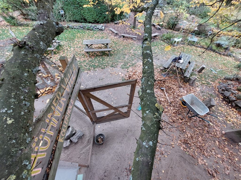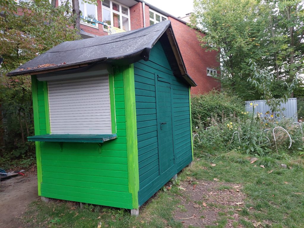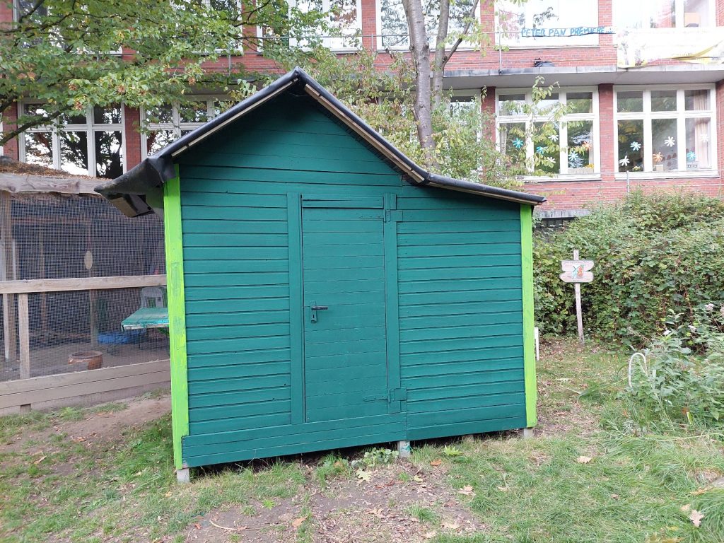 Zu jeder Jahreszeit sieht es im Schulgarten anders aus. Die große Hainbuche neben der Hühner-Villa verliert jetzt all ihre Blätter. Heute haben wir das Laub vom Dach der Hühner-Villa beseitigt.