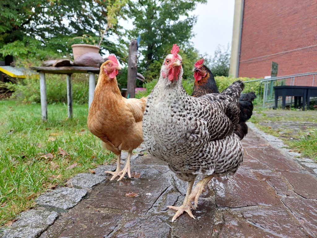 Es regnet in Strömen. Da stellen sich unsere Hühner lieber unter. Die trockenen Plätze kennen sie.
