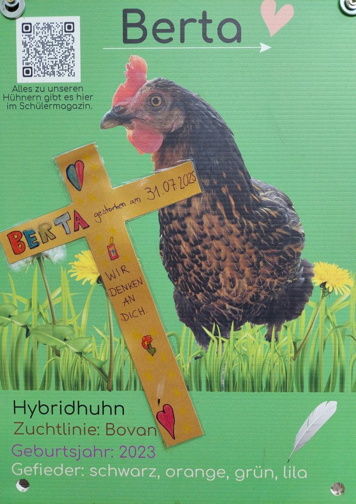 Heute mussten wir uns von unserer lieben Henne Berta verabschieden. Sie ist am Abend des 31. Juli 2025 verstorben. Berta war schon lange krank. Wir haben versucht, ihr das Leben bis zum Ende so schön wie möglich zu gestalten.