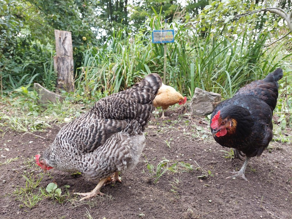 Die Hühner freuen sich immer über unseren Besuch. Wir freuen uns über die Hühner.