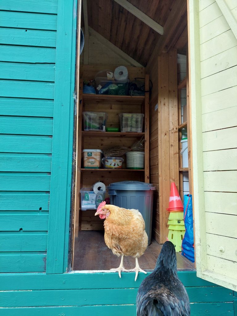 In der Hühnerhütte neben der großen Voliere steht das Körnerfutter in einer großen silbernen Tonne. Im Regal findet man Muschelgrit, das dem Körnerfutter hinzugefügt wird. Mehlwürmer sind das Lieblingsessen unserer Hühner. Im Regal steht immer ein großer Eimer mit Mehlwürmern. Außerdem befinden sich in der Hütte Eierkartons und Geräte, die man zum Saubermachen des Häuschens und des Geheges braucht.