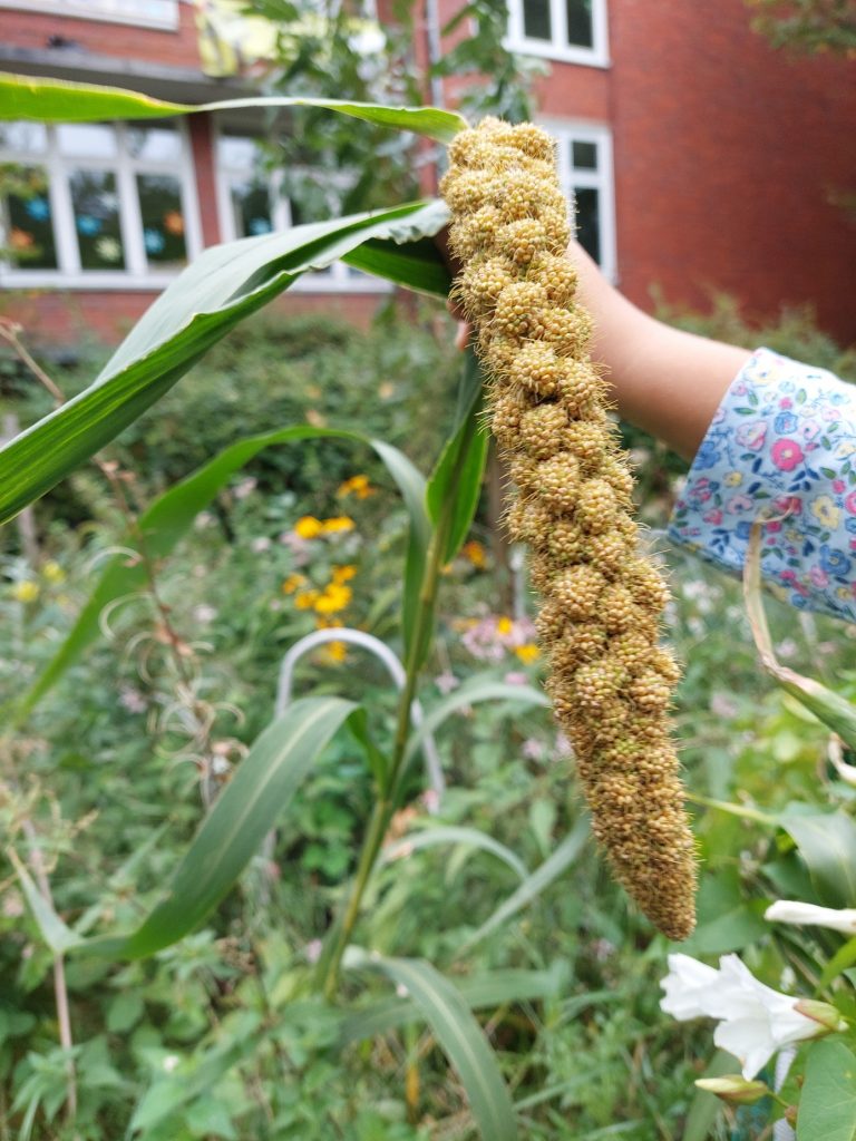 In unserem Schulgarten wurde Hirse angebaut. Die Kolben können nun geerntet werden. Einfach toll! Die Hühner lieben Hirse.