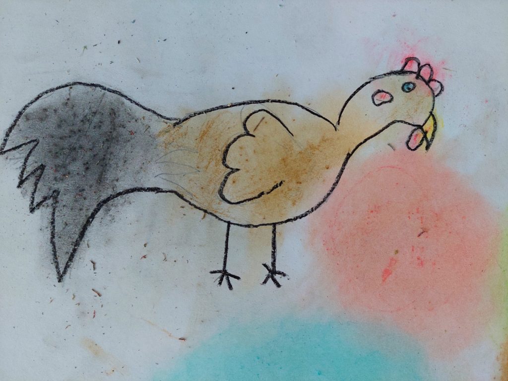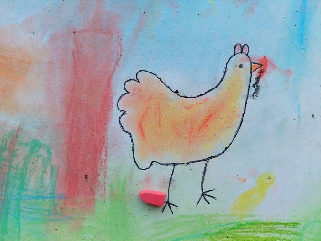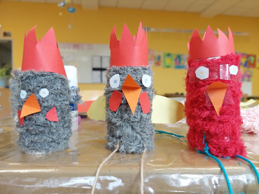 Zum Thema „Hühner“ kann man in allen Lernbereichen arbeiten. Diese witzigen Hühner entstanden nachmittags im Bastelraum.