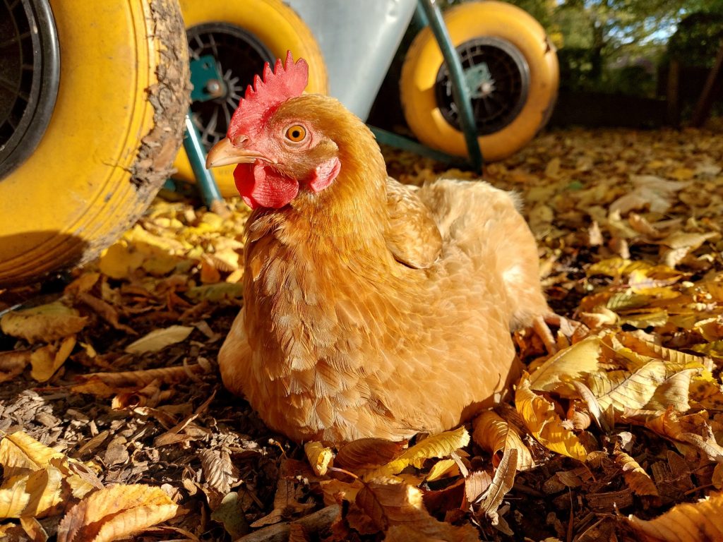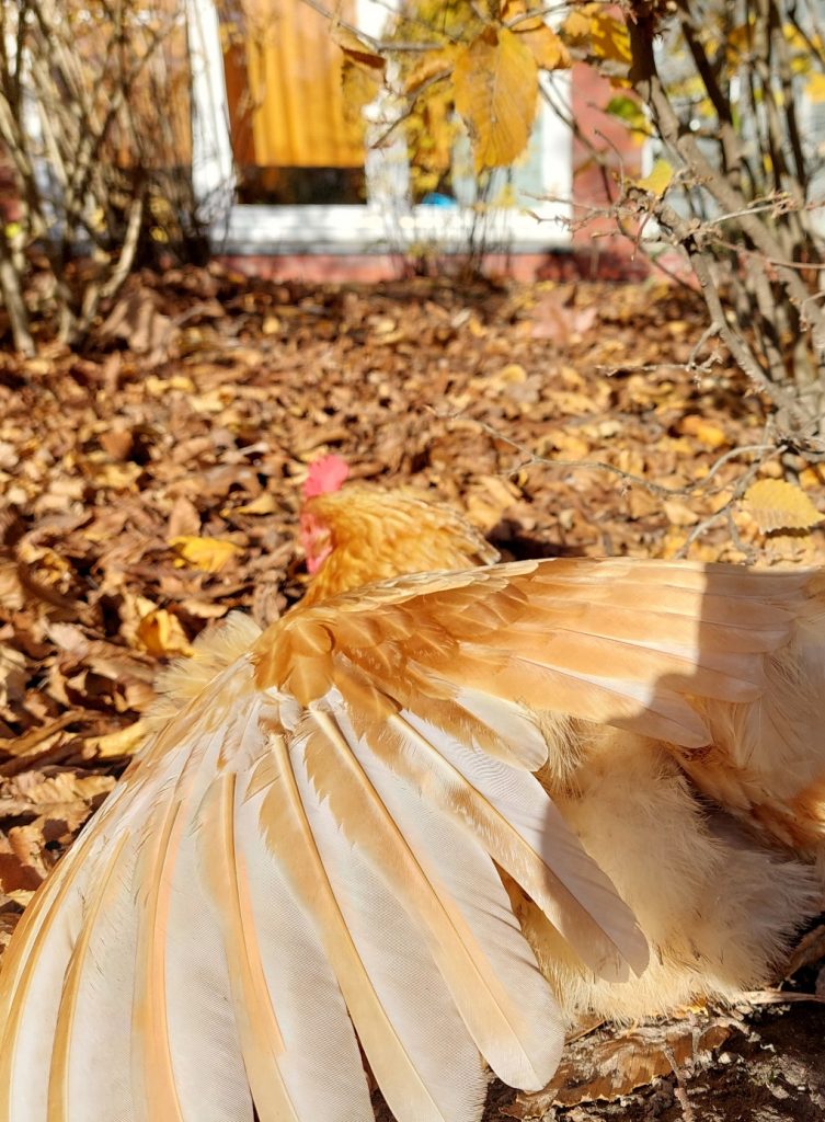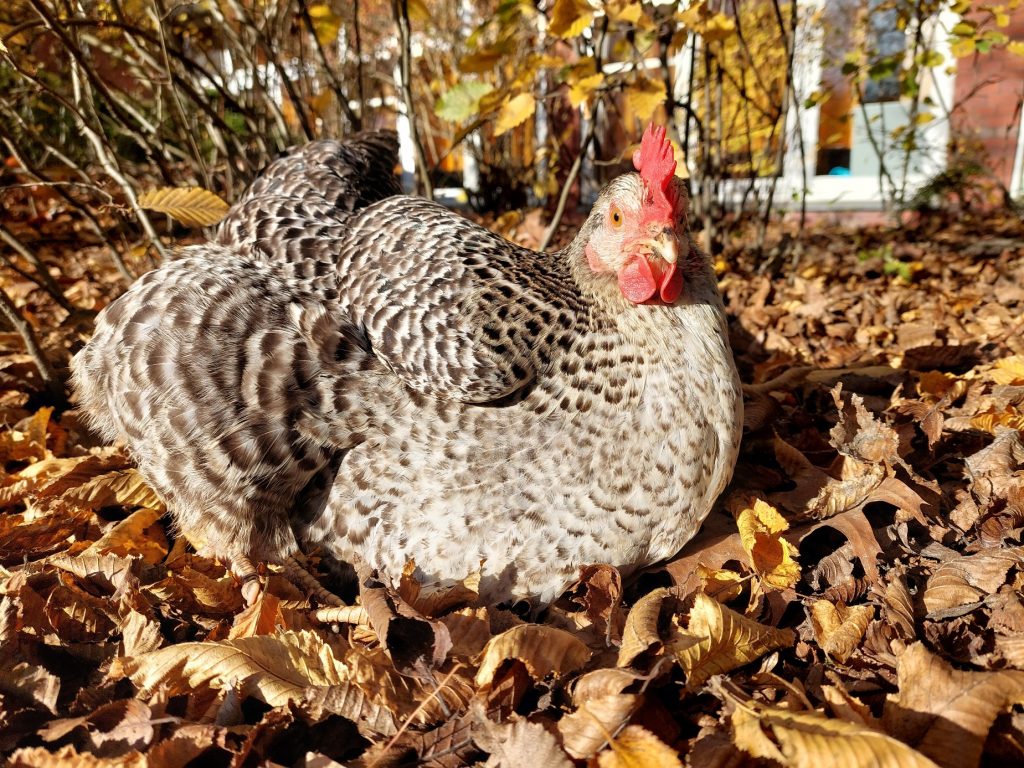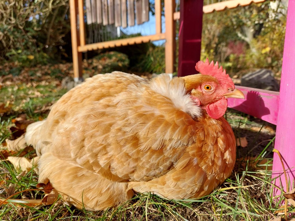 Frieda ist unsere goldene Henne. Heute liegt sie im goldenen Oktoberlaub und lässt sich von der Sonne wärmen.
