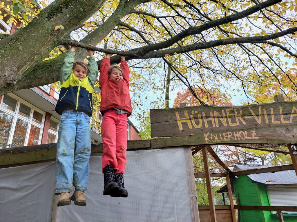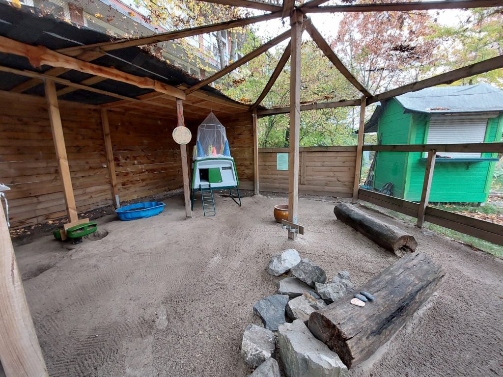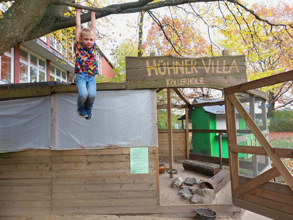 Unsere Schulkinder besuchen die Hühner sehr gerne in der Köllerholz-Hühnervilla und helfen beim Saubermachen. In der Voliere haben die Hühner viel Platz. Hier steht auch ihr Schlafhäuschen.