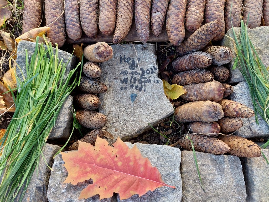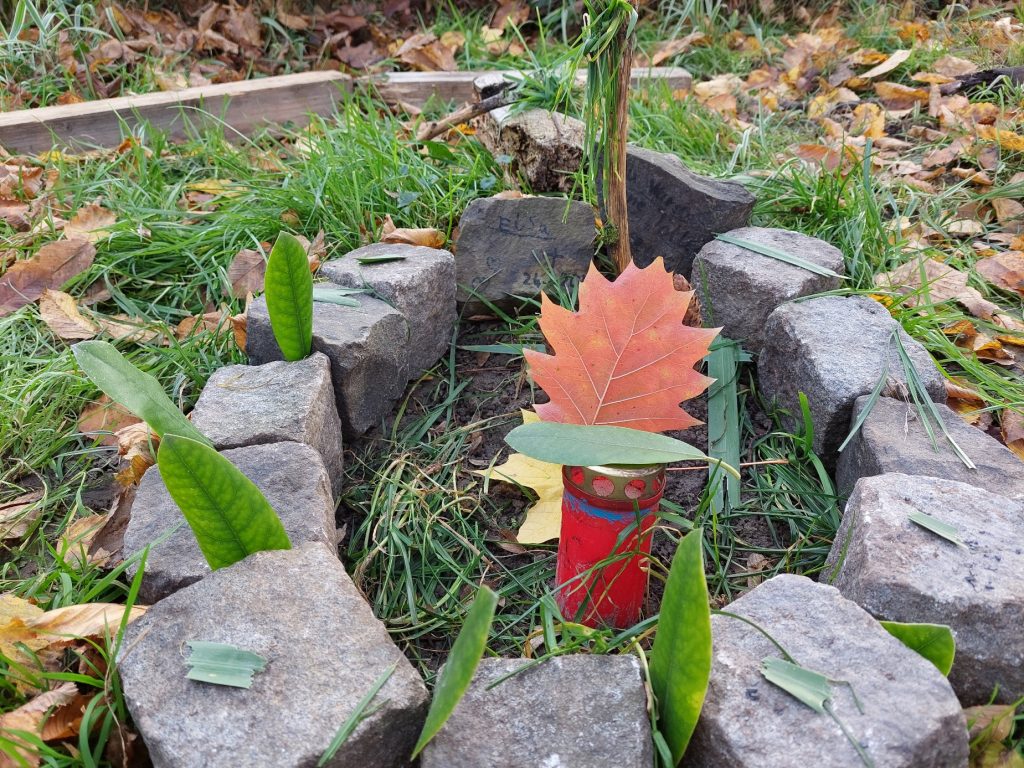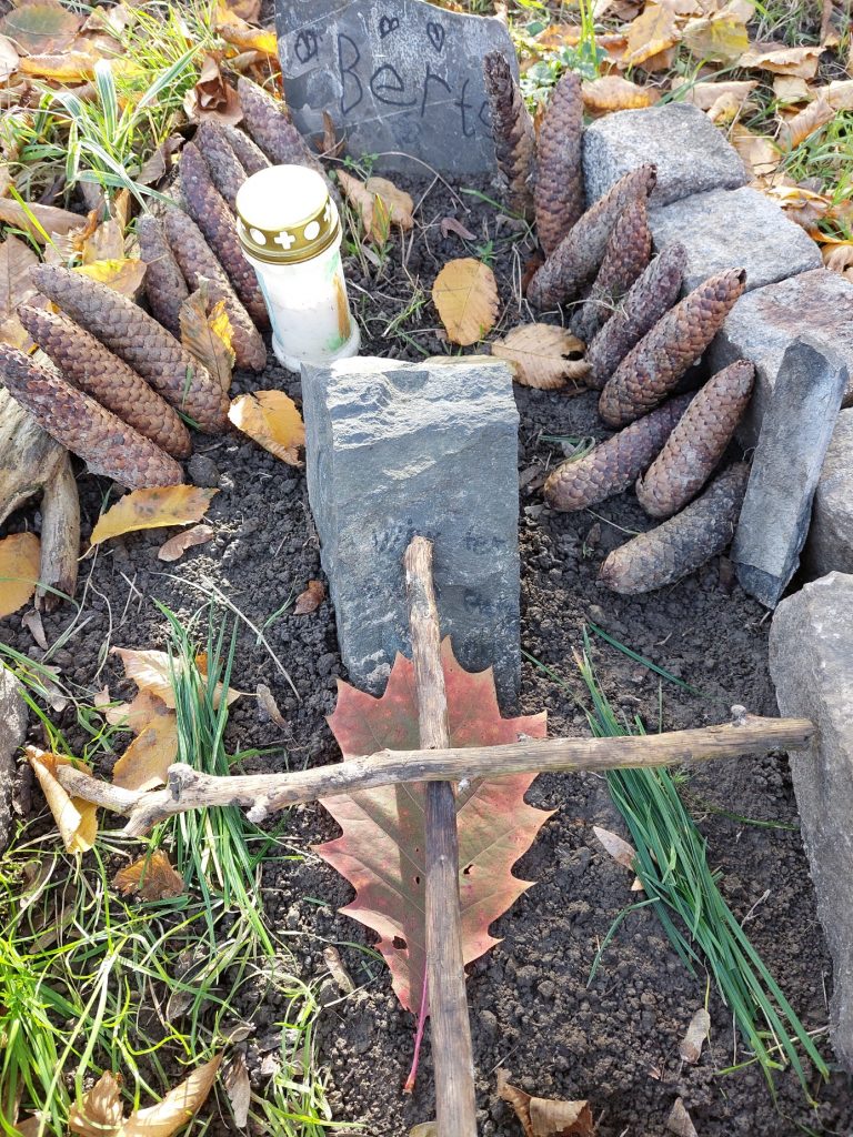 Gemeinsam haben wir Berta neben Hedi im Schulgarten beerdigt. Wir haben Blumen für sie gepflückt, einen Grabstein und eine Kerze für Berta aufgestellt.